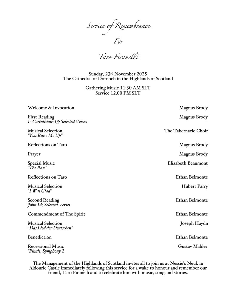 Within our own community, the Cathedral of Dornoch—one of our many churches—houses a quiet memorial chapel where commemorative plaques bear the names of those who have departed both worlds. Each plaque is illuminated by a small candle that burns perpetually in their honor. Outside, in the churchyard, a peaceful cemetery holds monuments to other friends cherished by the cathedral’s creator, ensuring that their lives, too, are remembered by those who pass through. Memorials to both friends and community members also exist at the Old High Church, the stage at Brody Castle and other special locations.