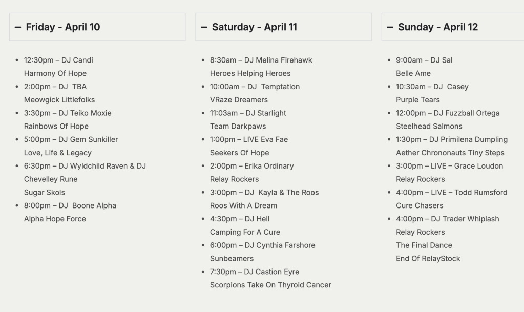 What makes RelayStock remarkable is not just its scale or its style—it’s the people behind it. Year after year, it is the passion, dedication, and sheer persistence of its volunteers that breathe life into the festival, and few groups embody that spirit more fully than the Relay Rockers. A cornerstone of Relay For Life in Second Life since 2005, the Relay Rockers have helped shape not only RelayStock itself, but the very culture of Relay across the grid. For all thirteen years of RelayStock’s run, they have stood as its driving force—organizing, sponsoring, and shepherding the event into the beloved institution it has become.
